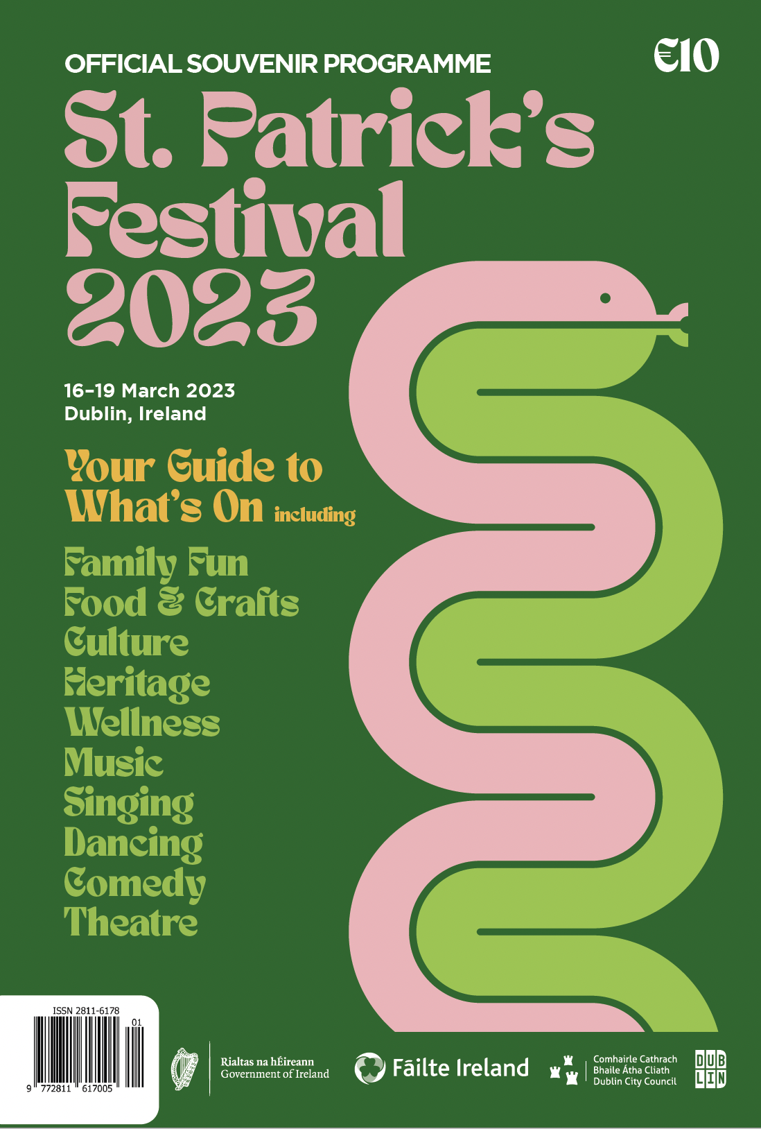 100 page official souvenir programme showcasing the National Parade, the Festival Quarter and a wide range of free & ticketed events across Dublin city centre, as part of St. Patrick’s Festival.